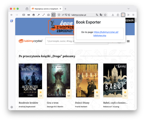 Będąc na stronie biblioteczki, kliknij ikonę rozszerzenia Książkowy eksporter na pasku Firefoksa.