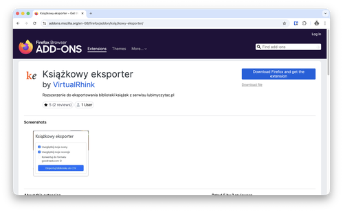 👉 https://addons.mozilla.org/pl/firefox/addon/książkowy-eksporter/ Autor dodatku: VirtualRhink | Licencja: AGPL-3.0 | Wersja: 1.2.0 -