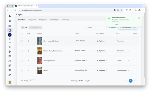 - Wybierz plik CSV pobrany z LubimyCzytac i zatwierdź import.