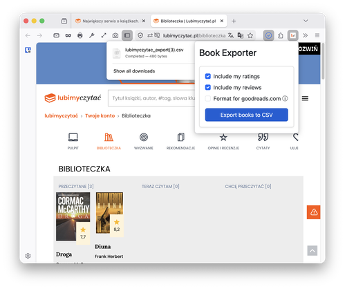 Masz setki książek na LubimyCzytac i chcesz je przenieść na inną platformę, zrobić backup swojej kolekcji, albo po prostu wydrukować listę przeczytanych tytułów? Z pomocą przychodzi darmowe rozszerzenie do Firefoksa — Książkowy eksporter. W kilku krokach wyeksportujesz całą swoją biblioteczkę do wygodnego pliku CSV.