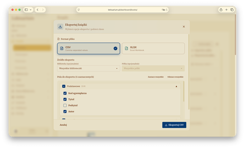 Po zaznaczeniu wszystkich opcji, możliwy jest też pełen eksport (na przykład w celu informacji o księgozbiorze na potrzeby ubezpieczenia go). Taka opcja przydatna jest też w przypadku chęci opuszczenia portalu Lektuarium.